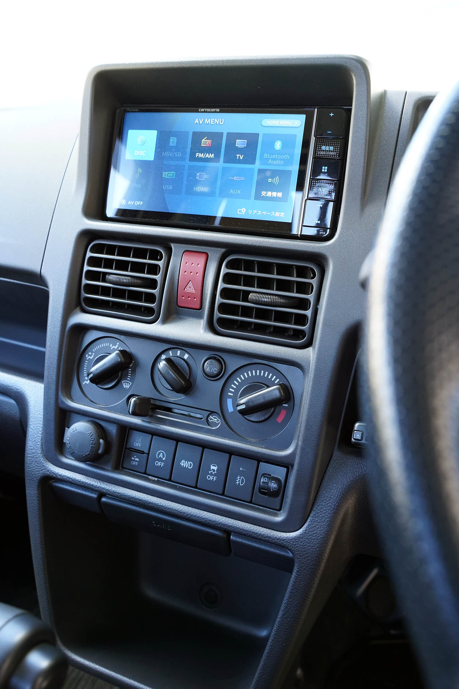 Aftermarket extras include 12-inch Japanese wheels, a Japanese double-DIN stereo with functioning Bluetooth and a very Japanese CD inside, and a rear work light.